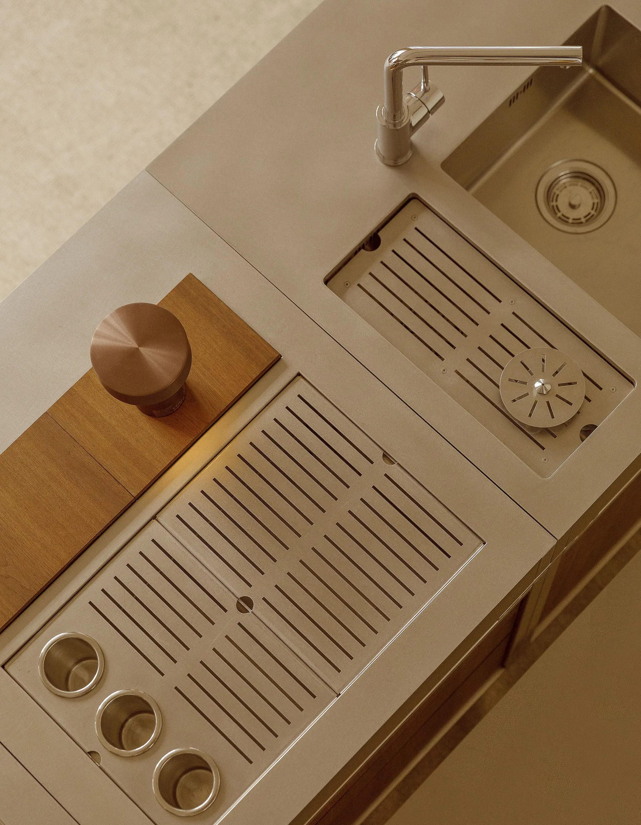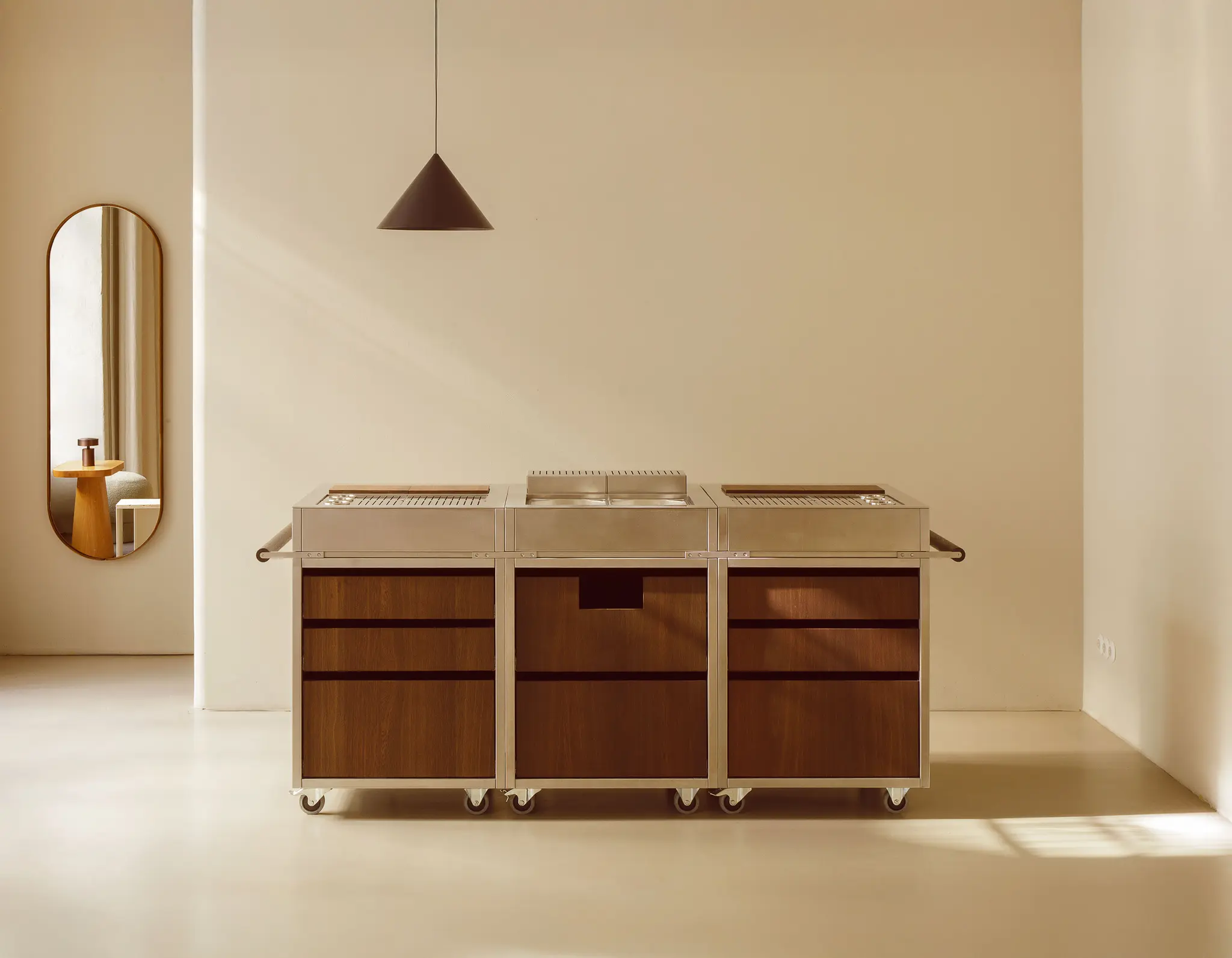 The mobile bar impresses as a confident object, designed for professional use with maximum impact. The combination of industrial-grade stainless steel and carefully crafted solid wood elements creates a deliberately reduced yet characterful aesthetic – clear, understated, and compelling.